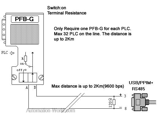 The largest communications range between the USB/PPIM and PLC are up to 2 kilometers (9.6K bps) or 1 km(187.5Kbps),when external plus terminals 120 ohm resistance is needed to connect between the pin3 and pin8 of the RS485 ports (DB9 Male) to eliminate signal reflection. And a PFB-G Bus Isolators is needed to install at the end of PLC. 0.22 mm2 or more unshielded twisted pair lines are used for Communications. When the distance is longer than the length of cable, a RS485 repeaters (model: E485GP), can be installed in the bus for extending the distance.
